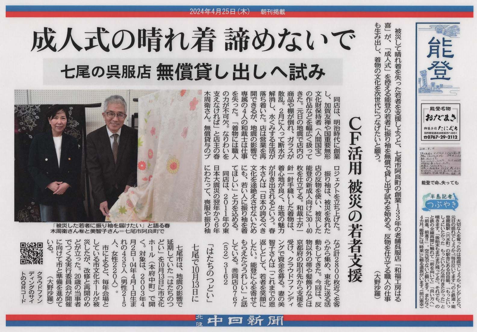 弊店のプロジェクト、振袖の無償貸し出しの受付が始まります。